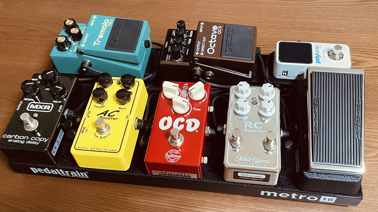 ペダルトレインシリーズを好んで集めていたのですが、ほぼ全てのサイズを使ってみて「PT-M16(横幅40cm、奥行20cm)」に落ち着きました。乗せられるエフェクターの個数、全体的なサイズと重量など、、、完璧でした。