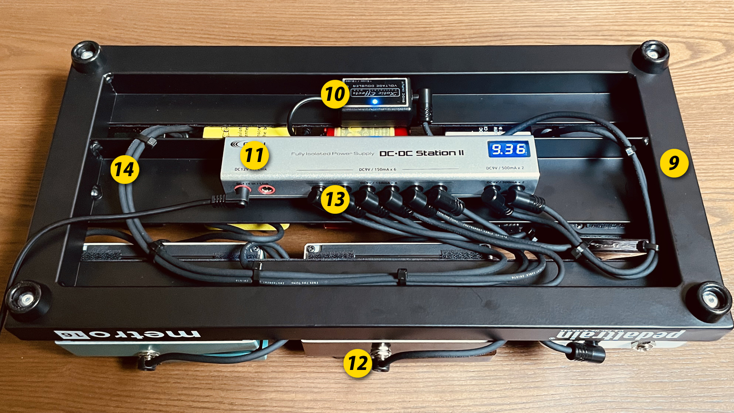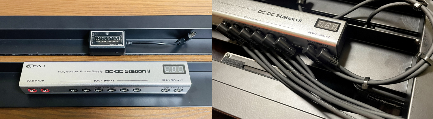 パワーサプライはCAJ DC/DC Station IIをチョイス。フルアイソレートだし、500mAが2つあるしで満足。あと純粋に8個のペダルを乗せているエフェクターボードなので8口でちょうど良かった感じです。ペダルトレインの裏面に取り付ける際、パワーサプライの厚みに注意が必要ですが問題なくクリアしてました。