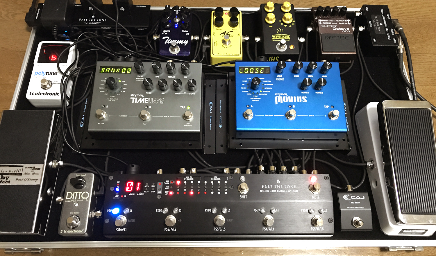 結構大きめのシステムだ。奥のコンパクト4個をスイッチャーのループに入れて、ストライモンのディレイとモジュレーションはMIDI制御ですね。ハッキリ言ってここまでデカいとスタジオへ持っていくのに苦労すると思う。ぶっちゃけオーバードライブ2個とディレイ1個くらいで演奏って何とかなったりするもんです。曲にもよるけど。大きいシステムに憧れた時期を通り越してすっかり小型ボード好きになりました。