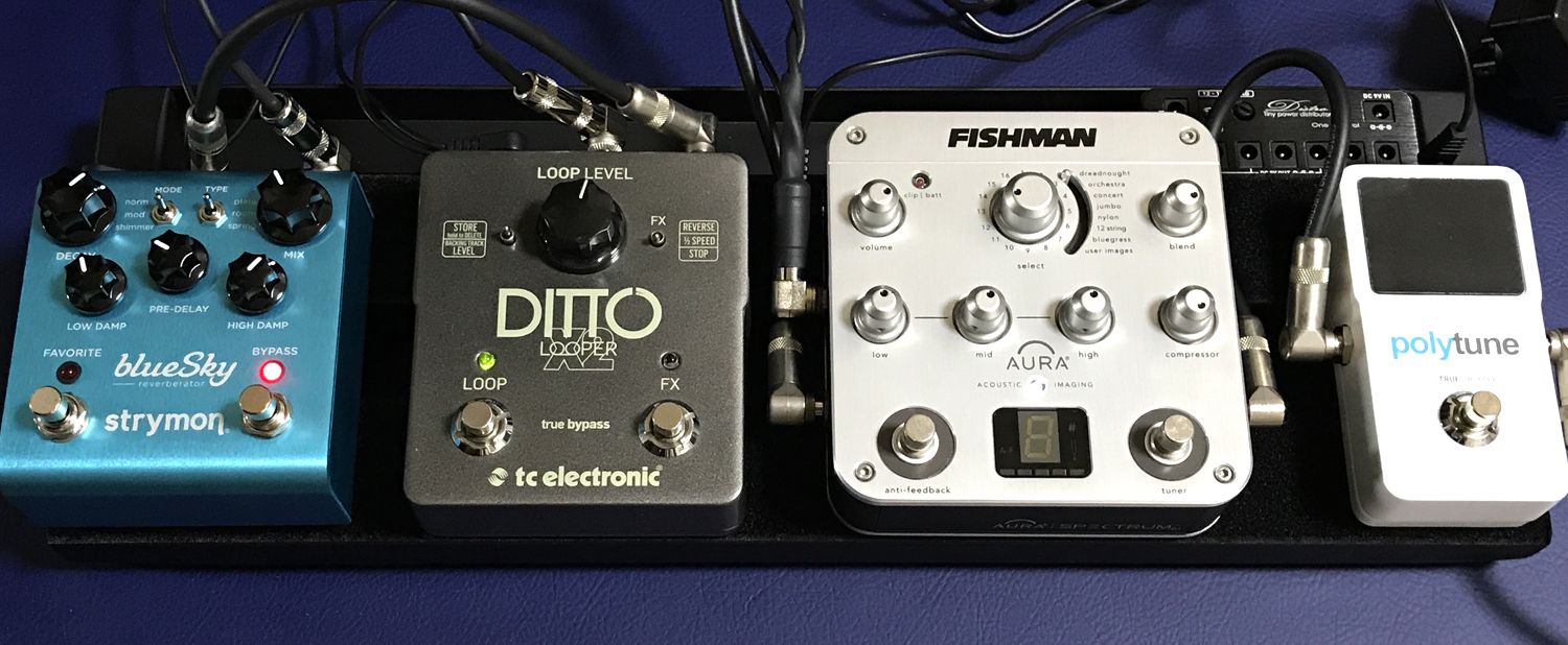 このFISHMAN Aura Spectrum DI Preampが本当にすごくて、シミュレートされた音がマイク録りしたような空気感だし、アコギのボディタイプも選んで音色を変えてくれる。そのクォリティが素晴らしくてお気に入りです。ドライとウェットを混ぜられるのも良いね。空間系エフェクト用にセンドリターンが付いているのでリバーブなど掛けても芯のある音色に奥行き感をプラス出来る。そしてプリアンプと同時にDIにもなってるので、ライブとかならそのままPA卓に音を持っていける。便利過ぎる機材です。エフェクターボード...これくらいのサイズがちょうどいいのだ。