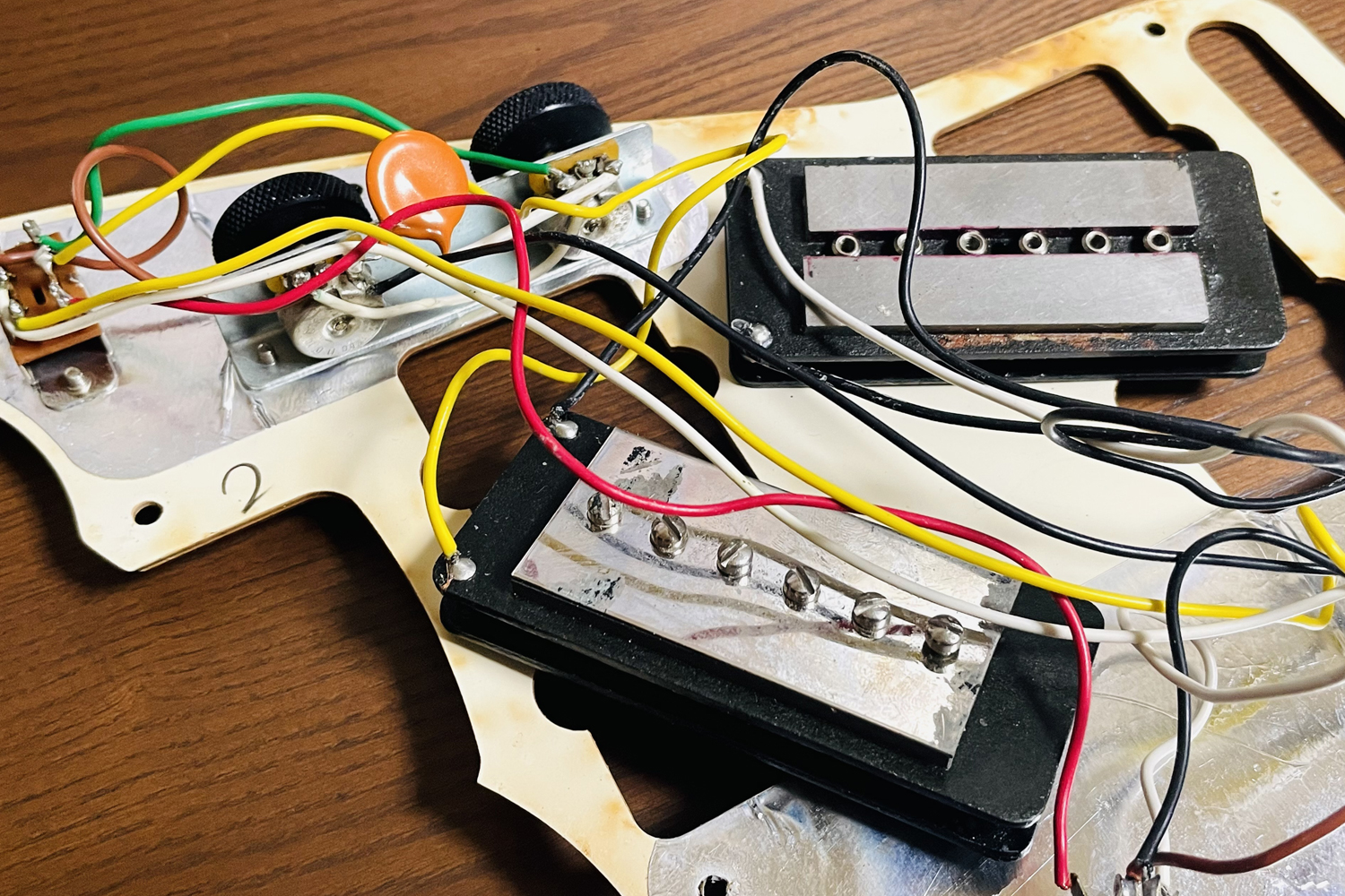 その後は音出しチェックをしてトラブルも沢山ありました。音が出ない事もあったし、どうにも消えないノイズが乗っていたり。謎だったのが、ポットの端子と配線は合ってるはずなのにボリュームをフルテンにすると音量がゼロ、音量をゼロにするとフルテンという逆の挙動があったり...。これは再びギターを開けて配線を取ってまた付けたら直っちゃいました。なんだったんだ。