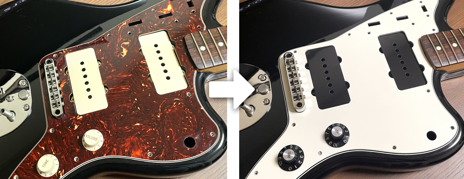 ちなみに、黒と白の参考にしたのは「INORAN JAZZMASTER® #1 LTD」です。ゴールドのピックガードはどれを買うか少し迷いたかったので、とりあえず白でコーデしました。