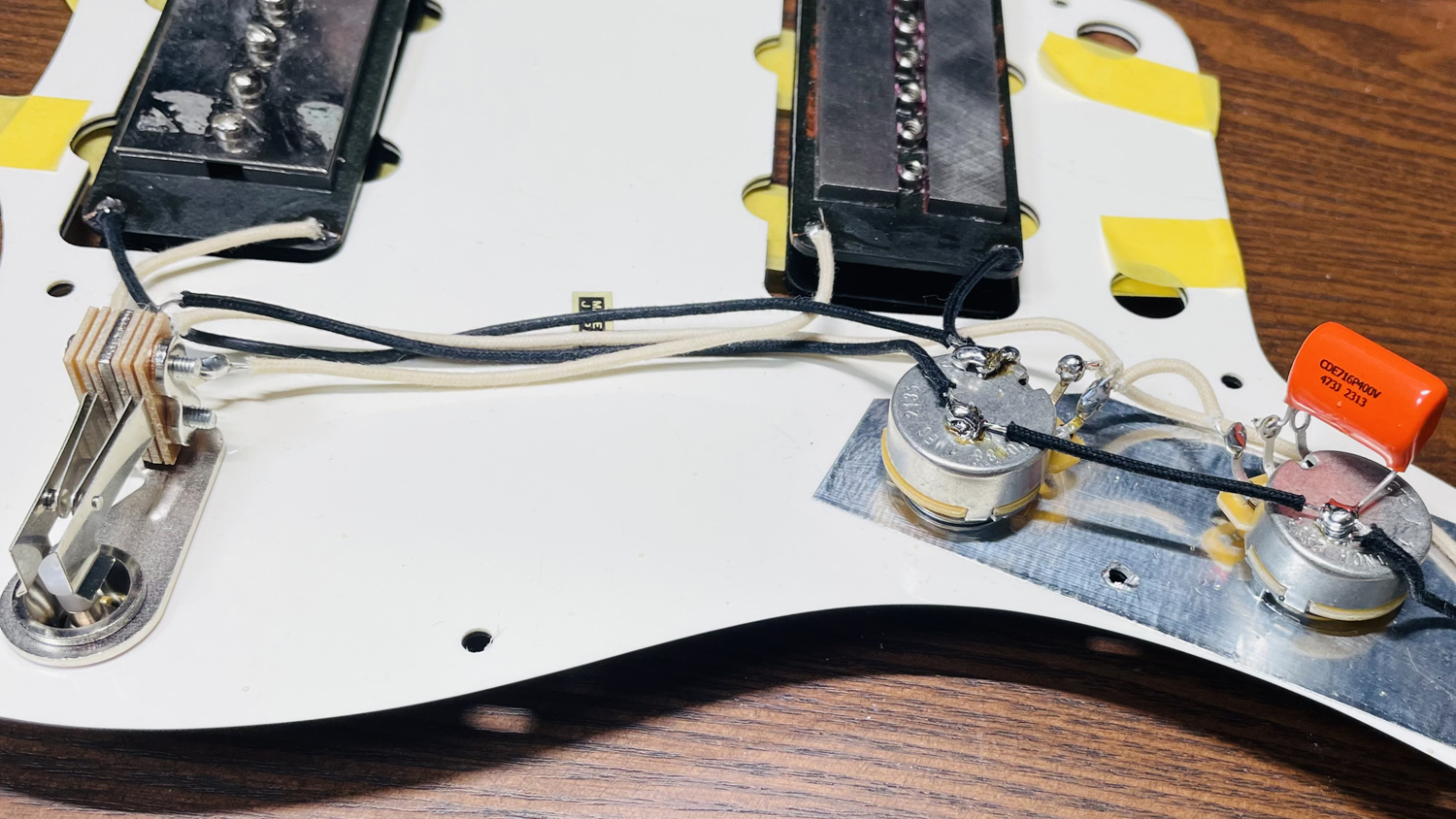ギターの内部にあるパーツ類を調べるとボリュームポット、トーンポット、トグルスイッチ、コンデンサー(キャパシタ)、ピックアップなど、知っていたようで知らない言葉を色々と覚えなきゃいけなくなりました。また、配線の仕組みでホットとアースも出てきます。これが案外好きなジャンル(?)なので調べていく内に「こんなシンプルな仕組みでギターって音鳴ってんの?」みたいな気持ちになりました。