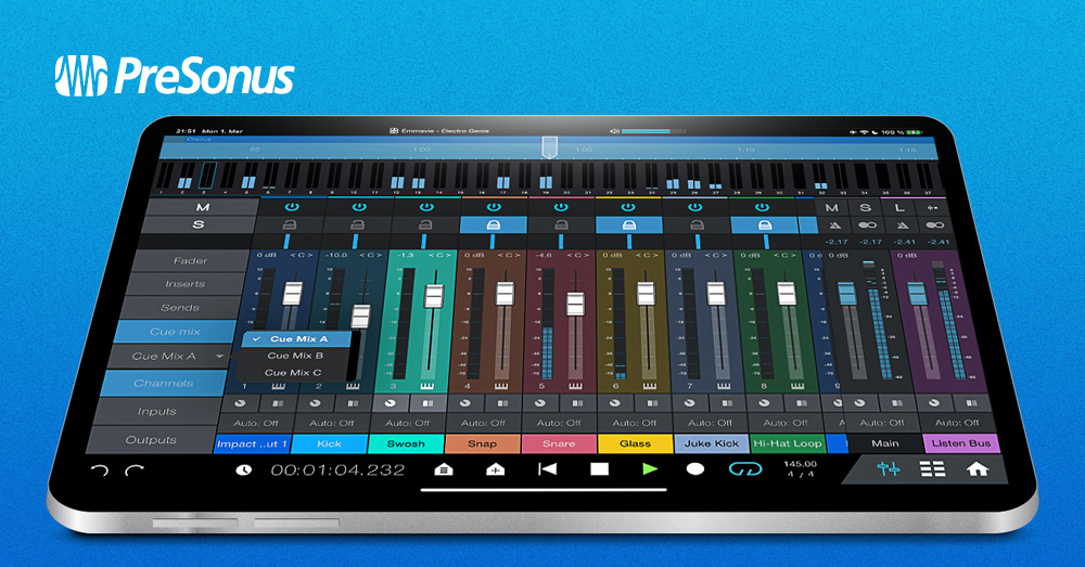 そこで登場したのがDAWソフト「Studio One」のメーカー「プレソナス 」ですわ。ここがStudio Oneのミキサー用にワイヤレスでリモートコントロールできるアプリを用意してくれている。これがある事でDAW編集画面の下にミキサー画面を表示させなくていいのだ。