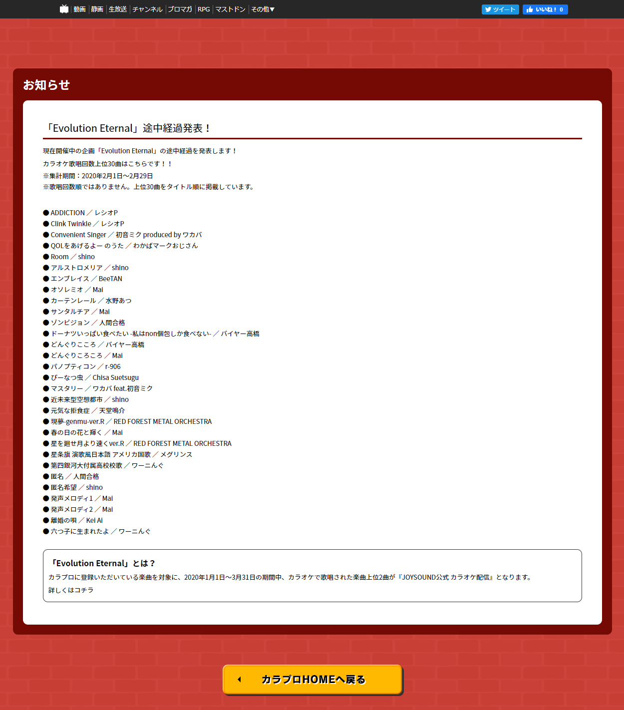前回に引き続き、カラオケ配信プログラム Evolution Eternalに掲載されました。「Clink Twinkle」と今回は「ADDICTION」もカラオケ歌唱回数上位30曲に入りました。(集計:2020年2月1日~2月29日)